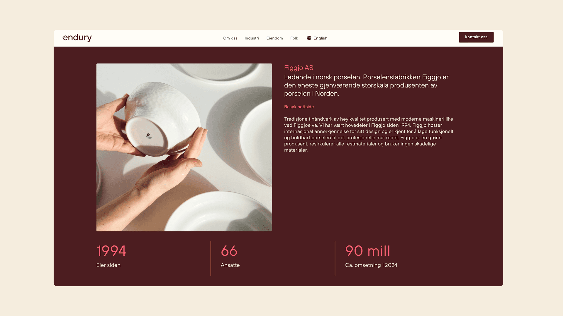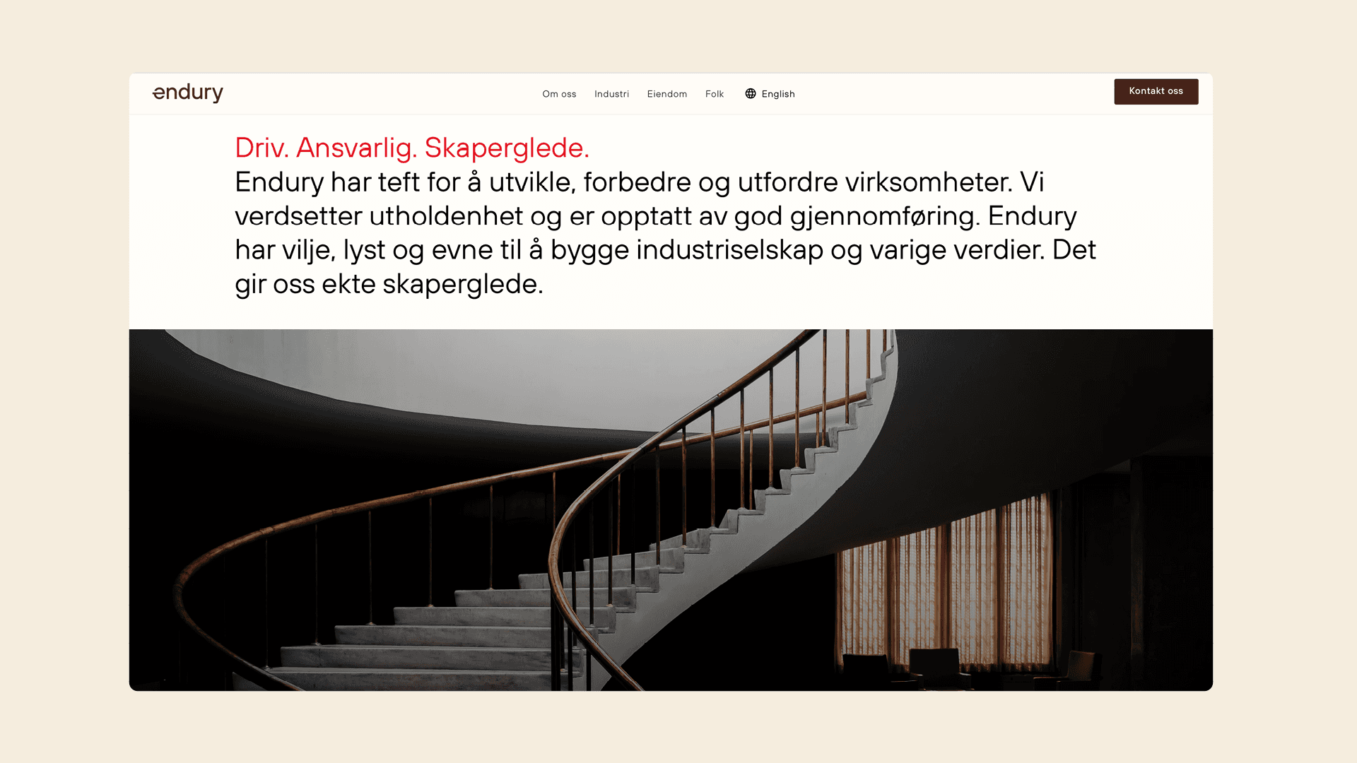 Navnet Endury vokste frem som et uttrykk for utholdenhet og varighet. Verdier som sitter i ryggraden. Den visuelle identiteten balanserer energi og tyngde. I dag er Endury en plattform for videre industribygging lokalt og globalt, med et uttrykk som rommer styrke, ansvar og har et lite glimt i øyet.